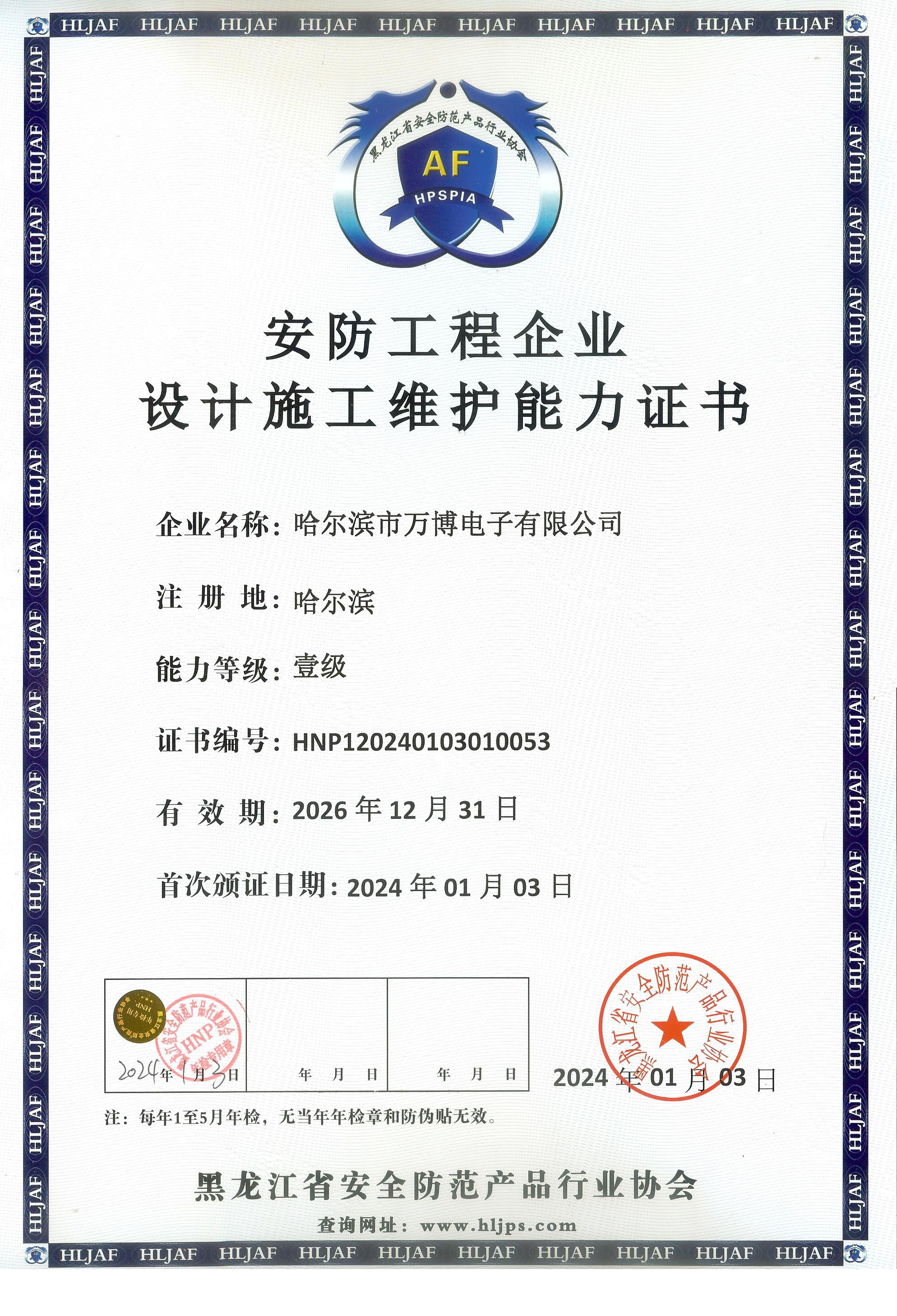 ****家在全省13個地市建立服務站的企業 ****家在金融行業承諾安防工程三年質保的企業 同時為工農中建四大銀行承建安防監控工程的企業 同時具有安防工程和建筑智能化工程資質的企業 哈爾濱市萬博電子有限公司以安全防范監控技術、樓宇智能技術、電子信息技術、計算機網絡技術為主要開發方向,是集科研、設計、生產和系統集成為一體的高科技經濟實體。 我公司資金實力雄厚,企業注......[詳細信息]